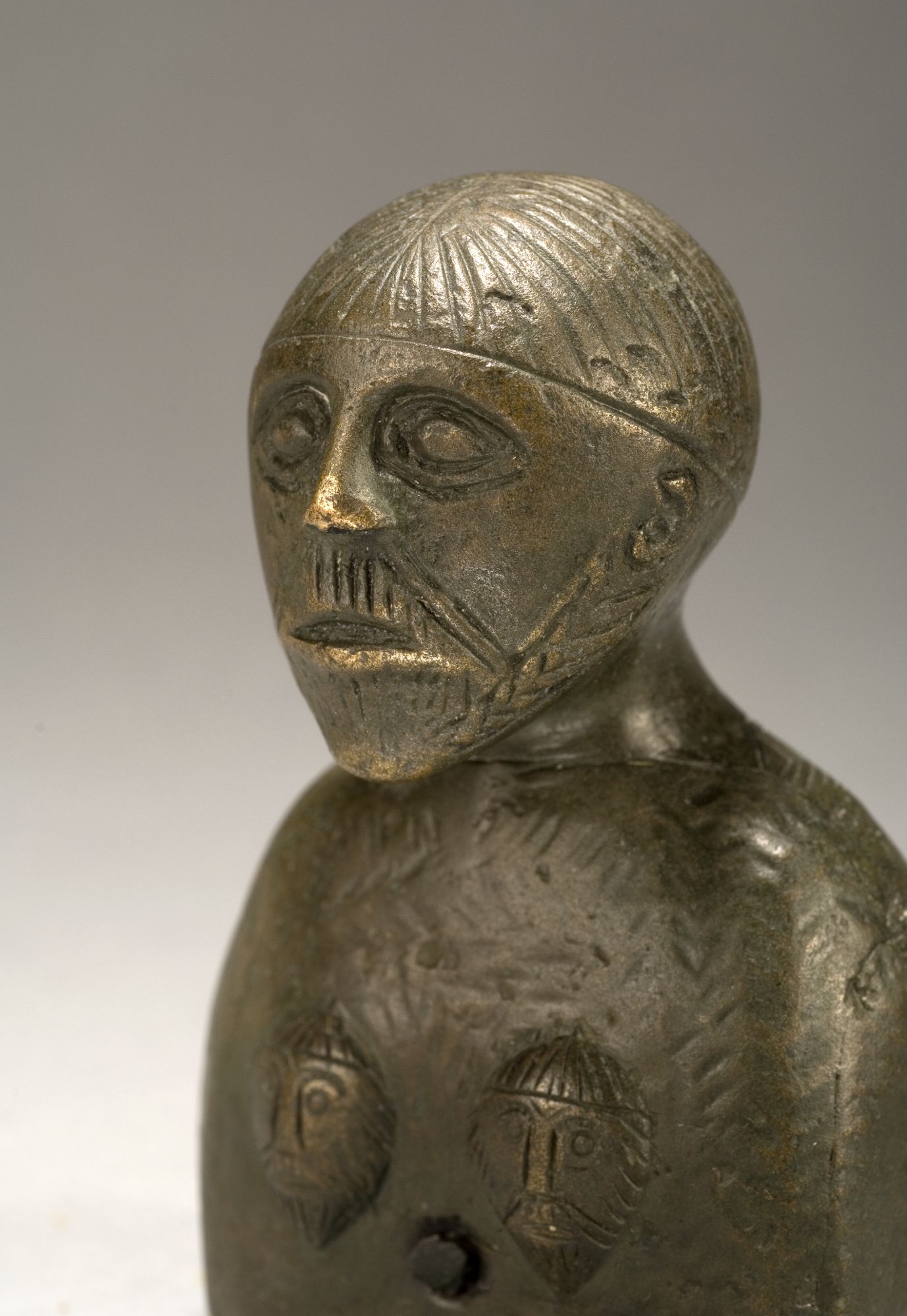 Scene Description: Source caption: "Albökemannen im schwedischen Öland" -- a bronze statuette originally from Alböke, now in the Statens historiska museum, Stockholm