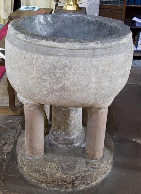 There is entry for Wysall [variant spelling] in the Domesday survey [http://opendomesday.org/place/SK6027/wysall/] [accessed 21 July 2016]; it mentions a church in it. The Thoroton Excursion of the Spring of 1902 noted: "The ancient font is, I think, early English". Listed in Cox & Harvey (1907), in Cox (1912) and in Guilford (1927) as a baptismal font of the Early English period [NB: Cox (1912) gives the date as ca. 1200 and notes it is raised on five shafts]. Cox & Harvey (ibid.) noted a 1660s font cover as well. The basin is cauldron-shaped, with a moulding at the upper rim, otherwise plain; the inner well is lead-lined; the central shaft and the four outer colonnettes have moulded capitals and bases, though the colonnettes may be modern replacements; on a round lower base and a small square plinth. Noted and illustrated in the Southwell & Nottingham Church History Project [http://southwellchurches.nottingham.ac.uk/wysall/hfitting.php] [accessed 21 July 2016]. [NB: a church existed in nearby Thorpe-in-the-Glebe, the remains of which are now part of the Churchside Farm. Pevsner & Williamson (1979) note that this church was "still occasionally used in 1743", but we do not know whether a font existed in it or not].