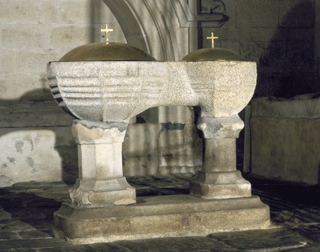 Scene Description: Source caption: "Fonts baptismaux de l'église Saint-Pierre de Plénée-Jugon (Côtes-d'Armor)"