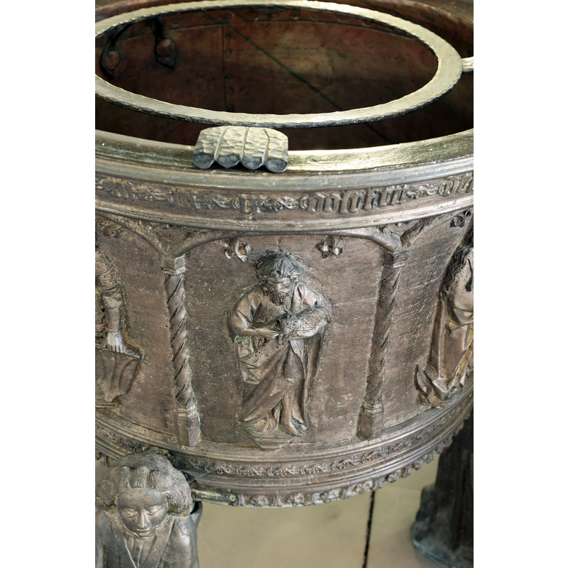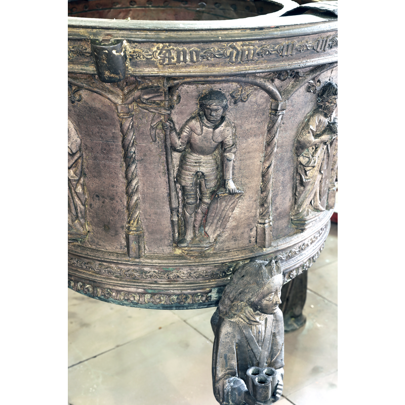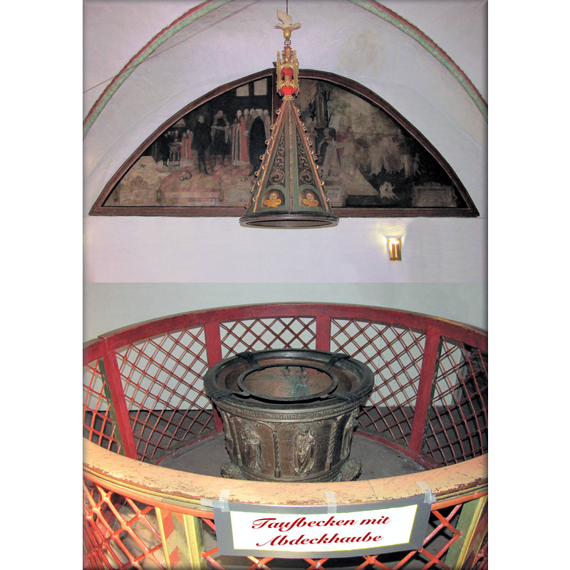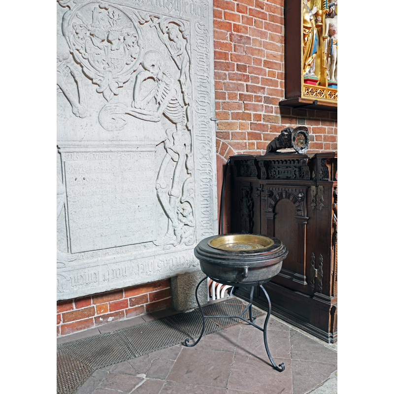 Scene Description: Source caption: "Taufbecken in St. Nicolai in Mölln, Schleswig-Holstein, gegossen 1509 von Peter Wulf".