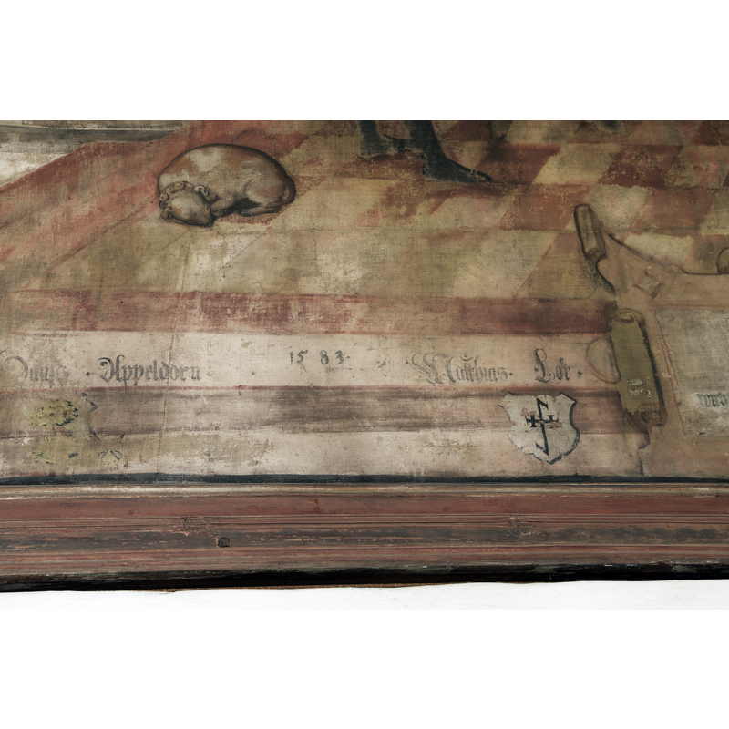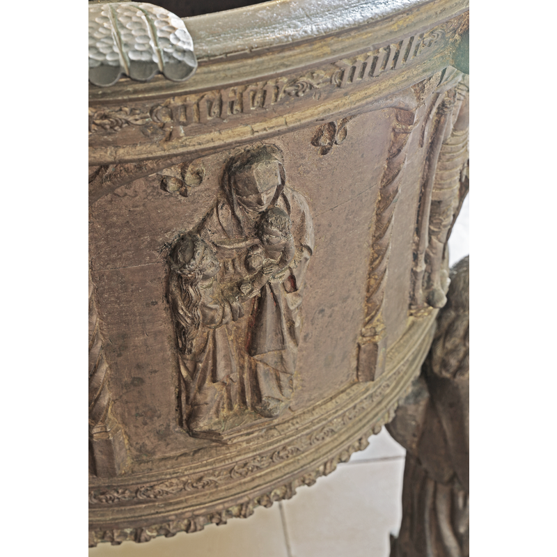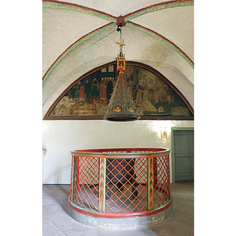 Scene Description: the painting is dated 1583 and includes on the left panel a baptismal scene using a bronze font, although the rendering makes it look quite different from the one in this church