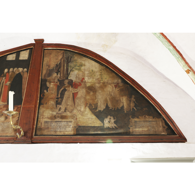 view of church interior - north wall - painting - detail - Crowning of Virgin Mary by Christ - St. Michael weighing souls - St. Medard calming the sea - fishing ship