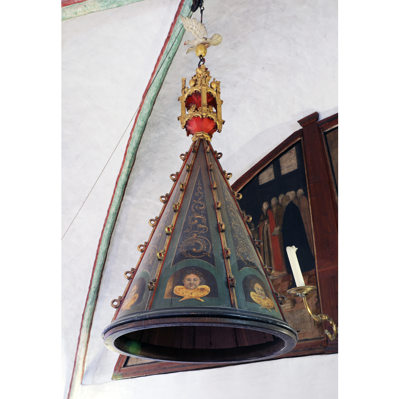 view of church interior - north wall - painting - detail - St. Medard blessing ship and fishermen - St. James blessing pilgrims
