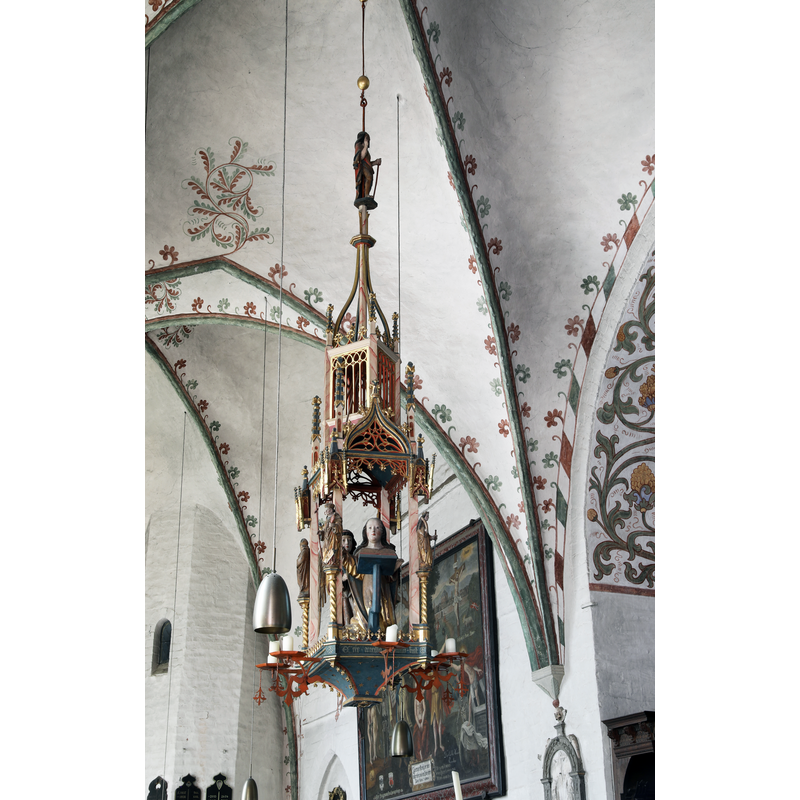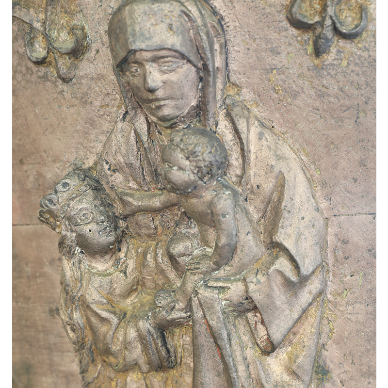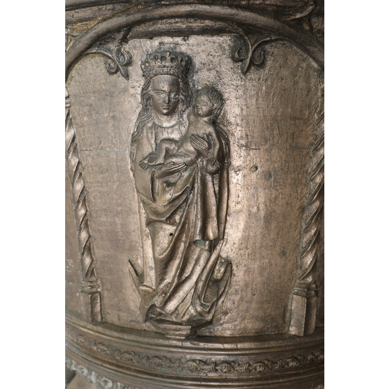 Noted and illustrated in Reinhold Spichal's Waren mittelalterliche Bronzetaufbecken auch verkörperte Raummaße? [www.eichamt.bremen.de/aufgaben/historisches/bronzetaufbecken-1628] [accessed 22 May 2017]: "In der St.-Nicolai-Kirche zu Mölln wird das Taufbecken von 1509 (171 Liter) mit einem Gitter aus geschmiedeten, durchgesteckten Eisenstäben innerhalb eines hölzernen Rahmens umschlossen. Der Zugang wird durch eine kleine Pforte ermöglicht." Riechert (2014) gives the decorative elements and identifies the figures: "Der breite Rand wölbt sich nach innen. Die Außenseite wird innerhalb zweier Profile von einer Umschrift umzogen, mit zweimal dem Lübecker Stadtwappen. Unter acht Arkadenbögen befinden sich Heiligenfiguren: Mauritius, Johannes d. T, Madonna auf der Mondsichel, Nikolaus, Katharina, Christophorus, Anna Selbdritt, und das Möllner Stadtwappen, ein Mühlenrad. Zwei Profilbänder mit Kreuzblumen bilden den Abschluss." Riechert further gives the full text of the inscription [cf. InscriptionArea] and gives the font at Eutin as rekated/cognate. On-site notes: the basin is of the characteristic bucket-shape that bell-makers used for these bronze fonts, and rests on four kneeling figures [angels? clerics?], carrying objects (one carries a chrismon container, another appears to have lost his object); the upper lip moulding has a running inscription which includes the name of the maker, Peter Wulf, and the date of the font 1509 [is there a 'C' after the 'D' in the date?]; on the sides of the basin is an arcade of round, almost flat, arches on very slender torsade columns with capitals and bases; in the arches are a number of figures and symbols identified in the local printed guide as follows: St. Catherine, St. Christopher, St. Anne, St. Mauritius, St. John the Baptist, Madonna and Child, St. Nicholas; our own list of the figures starting on the northeast side and reading L-->R: Madonna and Child with third figure holding object --> knight --> Apostle? or possibly John the Baptist holding a lamb? --> Madonna and Child --> bishop --> shields with coat of arms [cf. infra] ---> female figure crowned and with sword, possibly St Margaret? --> St. Christopher; also on the sides are the Lübeck and Mölln coats-of-arms; the lower end of the basin and underbowl are decorated with pattern ornamentation. The conical cover, also of bronze, is raised and lowered via a counterweight system. The font was made in 1509 by Peter Wulf of Lübeck The font is located in a round enclosure of wood and metal, with a gate that opens for access.