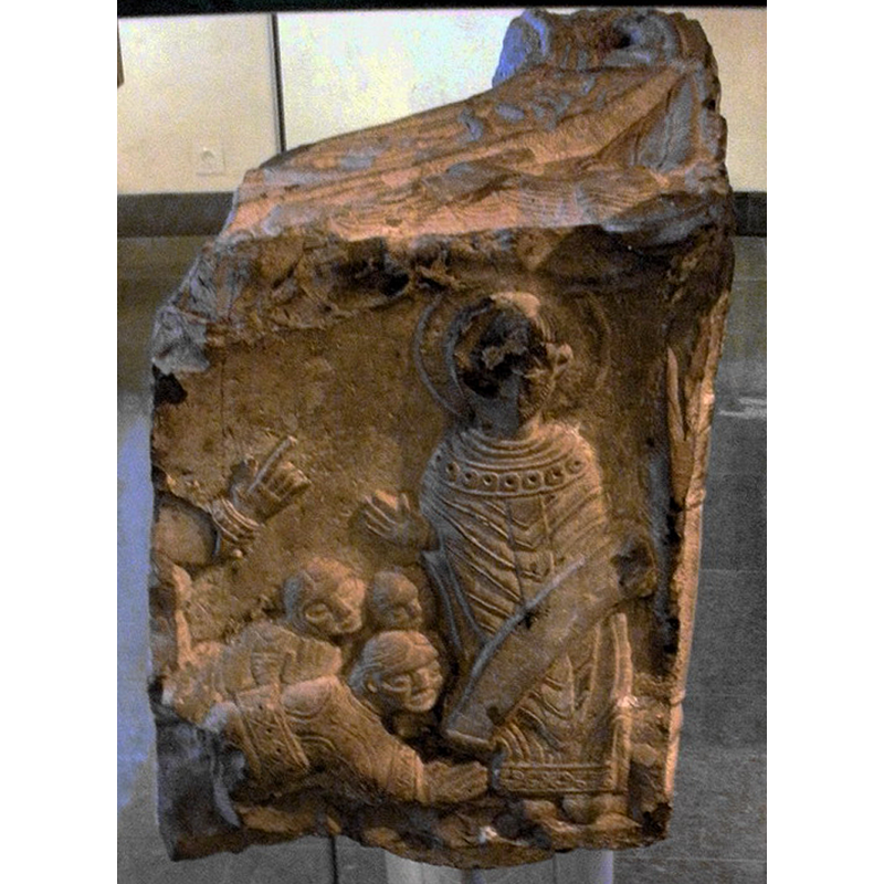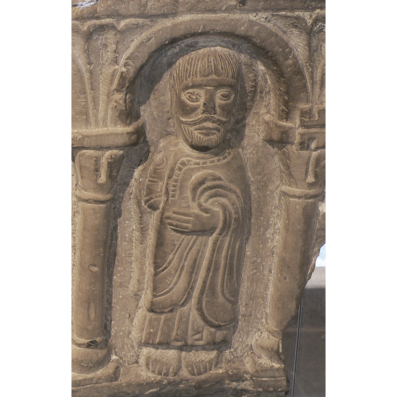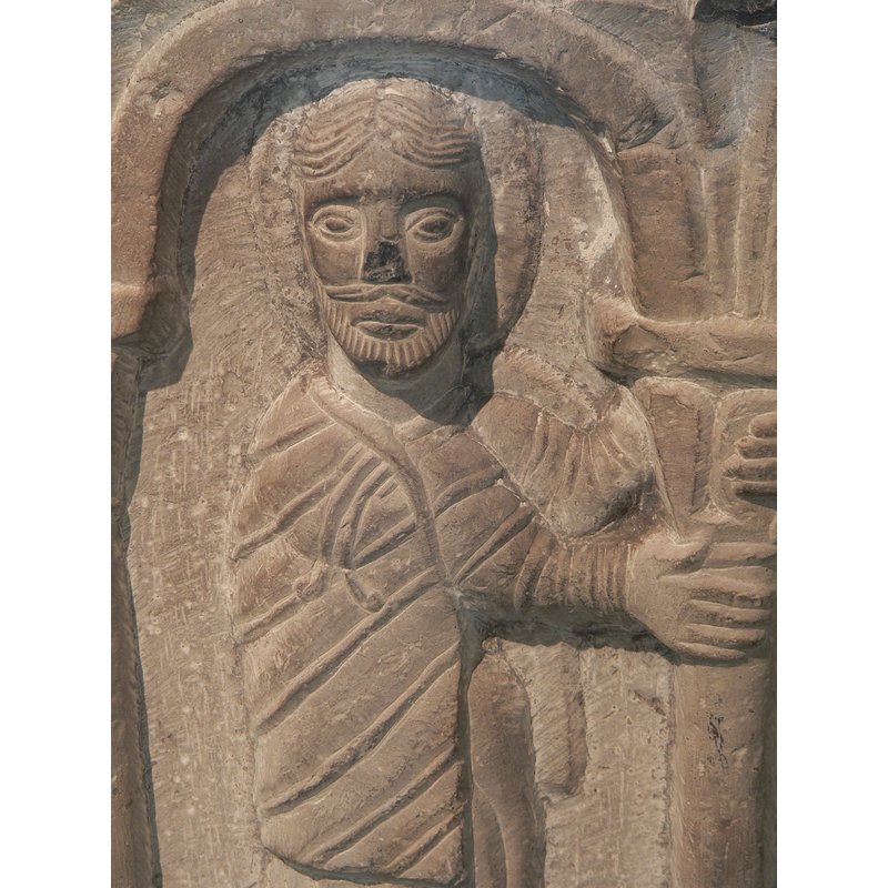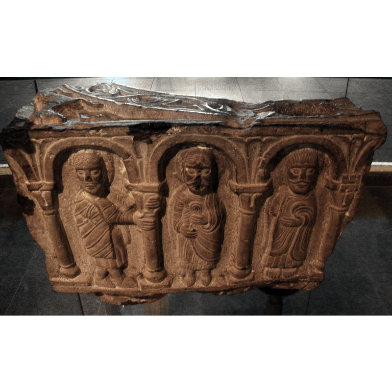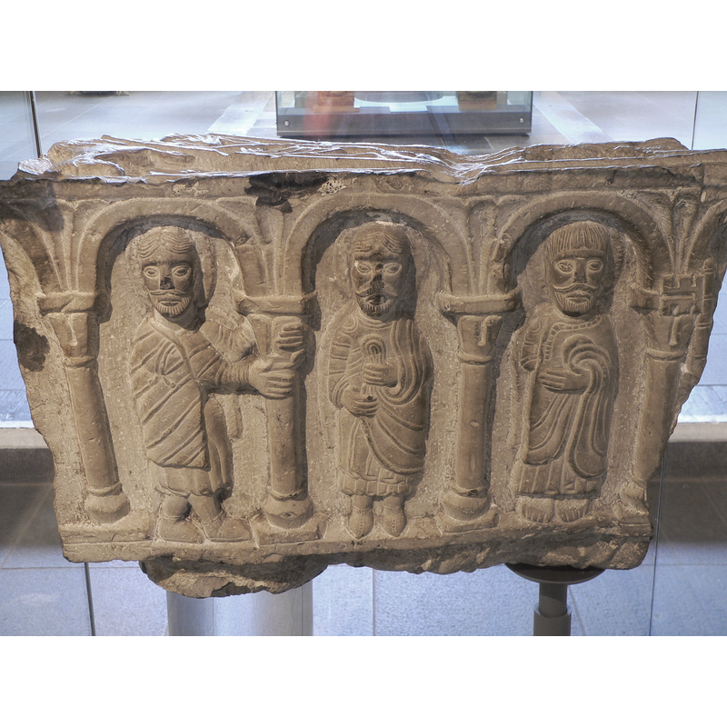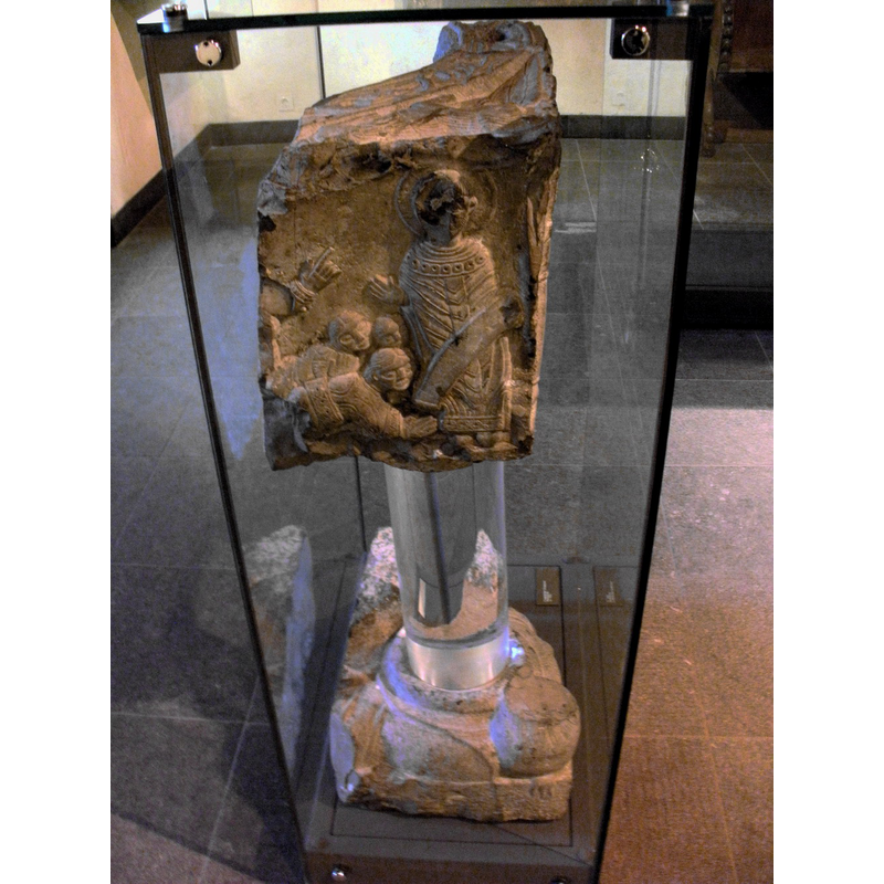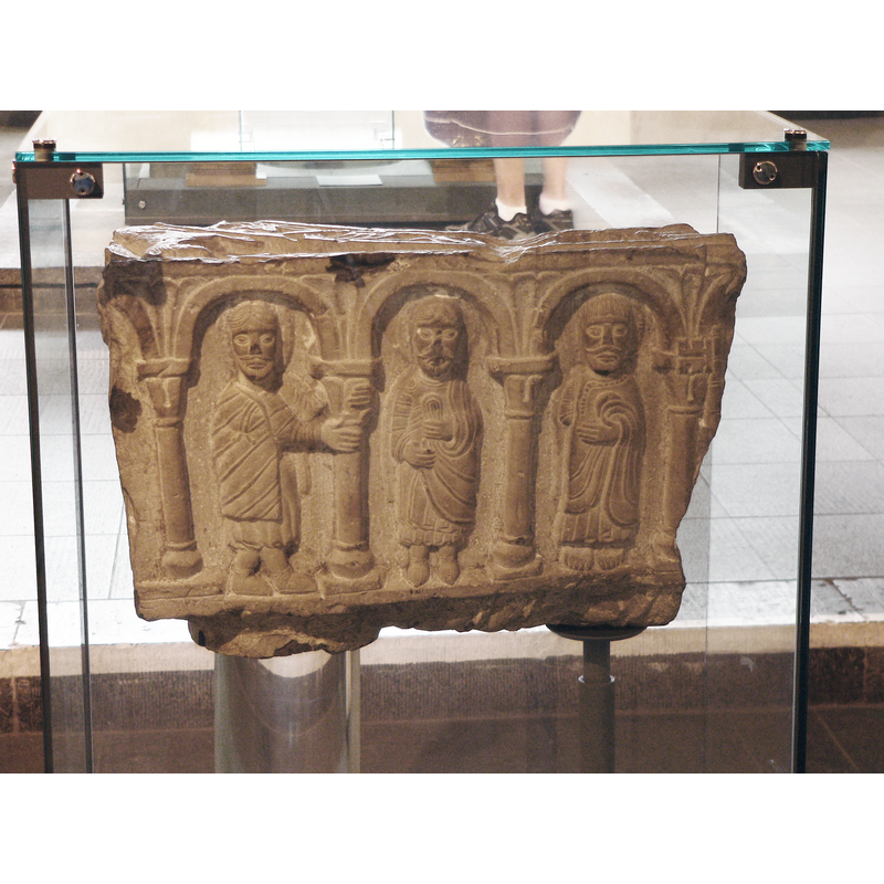 Fragment of a quadrangular font originally mounted on columns; only one side of the basin, and a small corner of the lower base remain; the basin fragment appears to be almost a full side and has an arcade of three round arches on columns with capitals and bases; in each arch is a standing haloed male figure: at the left the figure holds the column to the right with both hands; the figure in the centre arch holds its mantle with both hands; the figure in the right arch has only the right hand visible, the left being inside the mantle; the clothing of the figures is rich, with decorating motifs; some of the figures wear footwear, others are in bare feet; in the spandrels of the arcade are foliage motifs, but at the extreme right , below the spandrel is part of large key that was probably held by the figure in the next arch on the now missing side; the left side of the fragment has part of a scene that appears not to have been inscribed in an arch: a male figure stands on the right dressed in clerical clothing [bishop's?], perhaps St. Servatius himself [Servatius was bishop of Maastricht in the late 4th century]; the scene includes several figures prostrated at the foot of the standing cleric, and there is a hand with a finger pointed towards the cleric's head on the left, but the rest of the scene is missing; the upper surface of the rim shows part of the broad rim of the inner basin, decorated with a vine or foliage; the spandrels and the rest of the upper surface is also busily decorated but the details are very worn and difficult to identify [especially since the fragment is encased in a protective glass cage]; the fragment of the base shows traces of a mane and claws, probably the remains of lions that decorated this part of the font. The design of the font, as well as the style of carving, is quite similar to those of the Tournai fonts of the 12th century, and could possibly be from one of the workshops associated with the production of Tournai fonts, although the stone of this font is not the dark black-blue limestone characteristic of the Tournai group. The original stone church is said to date from the 6th century, but the present building dates from the 11th, 12th and 13th centuries, with additions and changes through later centuries. It became the main parish church of Maastricht in the early 19th century. Pubben (2019) argues that these feagments are part of the same font as those in Merksem [cf. BSI entry for Merksem]
