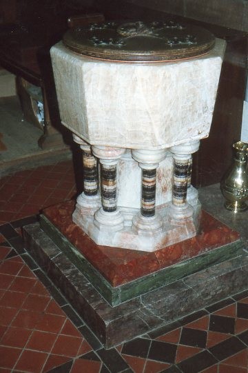 Ellis (1902) notes: "The font that was in use before the rebuilding of Thurstaston church is now preserved (?) in the tower of the old church, among grave-slabs and building material. It is very rude in construction, of fine sandstone, but has been painted. The bowl is an irregular-sided octagon, lead-lined but without any drain, and without the slightest trace of ornament. It is supported on a plain cylindrical shaft, which in turns rests on an octagonal base. [...] It is impossible to determine the age of this ugly specimen, and the narrowness of the bowl in relation to its height is probably an indication of its being post-Reformation in date." A history of this church compiled by Richard Turner [http://web.archive.org/web/20101011115729/http://www.btinternet.com/~martin.amlot/history_of_the_churches.htm] [accessed 11 December 2012] notes: "The earliest mention of a Church occurs about 1125 [...] However, other evidence suggests that it may have existed in Saxon times [...] The whole of the upper portion of the font is constructed of a solid piece of Mexican onyx, the pillars of Blue John stone and the base of three different kinds of marble. [NB: we have no information on the font from the original church here]
