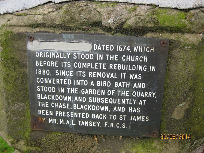 There is an entry for [Old] Milverton [variant spelling] in the Domesday surve [Folio: 239v] [http://domesdaymap.co.uk/place/SP2967/old-milverton/] [accessed 4 February 2015], but it mentions neither cleric nor church in it. The Building News (Sept., 10, 1880: 312) reports the reopening of this church after a general re-building; it notes: "The reredos and font have been executed by Messrs. Mabey and Co., of London." The article makes no reference to the earlier font of the pre-renovation church. An older font, dated on a plaque attached to it to 1674 is now located in the churchyard; it was replaced by a new font during the 1880 renovation of the church [cf. supra]. The Victoria County History (Warwick, vol. 6, 1951) notes: "in 1231 Walter Spigurnel claimed the advowson of Milverton Church from the Prior of Kenilworth [...] The old church of ST. JAMES, on the crest of a hill which slopes west and north to the Avon, was a small building, apparently mainly of the 13th century, with chancel, nave with north aisle, and west tower. The VCH entry does not mention a font, nor is a font mentioned in the English Heritage listing [Listing NGR: SP2968767387] (1987). The font that was in the church just before 1880 renovation was discarded and served as a bird-bath before being returned to the church, and placed in the churchyard; it consists of an octagonal basin with curved underbowl chamfer; an inscription on the side is now much eroded; a plaque has been attached to the basin to record the date and its unfortunate history; the basin is raised on a pedestal base that probably has nothing to do do with the original font, roughly square and with a rounded top.