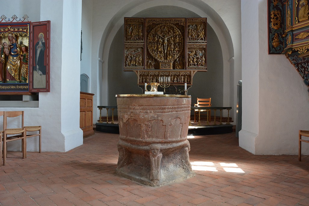 Scene Description: Source caption: "Hviding Kirke i Danmark. Hviding kirke, døbefont"