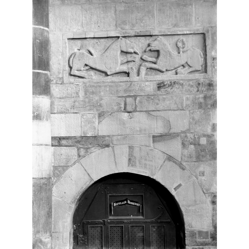 Scene Description: a fragment with a very dynamic-looking lion found in the excavations of the foundations of this church -- Source caption: "Oudheidkamer, reliëfstuk gevonden in de fudamenten van een huis bij de Sint Plechelmuskerk".