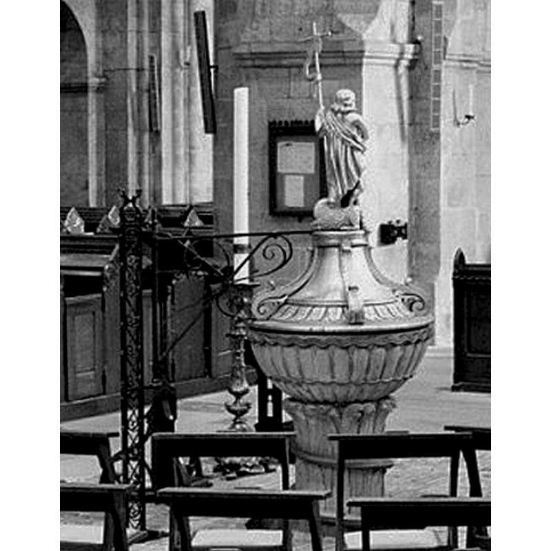Eyck (1846) mentions early fonts at Oldenzaal, Heemse, Loosduinen and Schokland, that are now lost. EH ter Kuile (1971) [www.dbnl.org/tekst/kuil005prov01_01/kuil005prov01_01_0017.php] [accessed 31 December 2015] notes that the present font in this church was executed by architect Freytagh from Bentheim in 1814 using Bentheim sandstone; the cover is made of gilded wood, and has a large statue of John the Baptist as finial. [NB: the stone font at Sint-Antoniuskerk, also in Oldenzaal is early-20thC]