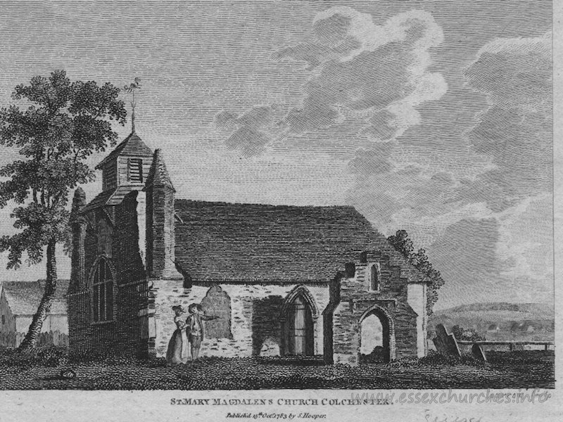 There are seventeen entries for Colchester [variant spellings] in the Domesday survey [http://opendomesday.org/place/TL9925/colchester/] [accessed 8 June 2018]; a priest is mentioned as lord three times (two in 1066, one in 1086) and "0.5 church lands" is noted in one of the entries, but none of them mentions a church, though there must have some there at the time. The entry for this borough in the Victoria County History (Essex, vol. 9, 1994) notes: "The church may have been founded by Eudes the sewer in the 12th century as the chapel of St. Mary Magdalen's hospital, [...] but it had acquired parochial status by 1237 when the church, ecclesia, of St. Mary Magdalen was confirmed to St. John's abbey, and in 1254 the master of the hospital was rector of the church. [...] The hospital chapel had been destroyed before 1610, and the church needed repair in 1633. (fn. 467) After the siege in 1648 it was abandoned until 1721 when Thomas Parker, the Lord Chancellor, repaired it at his own expense. [...] In 1650 when Henry Barrington, a former mayor and a protestant extremist, was appointed master of the hospital, the living was left vacant and the church was used as a poorhouse. [...] The church seems to have remained in ruins and unused until 1721, when the Lord Chancellor appointed the first of a regular succession of rectors. [...] The church was demolished in 1852, and a new one, designed by F. Barnes in the decorated style, was built just to the south and consecrated in 1854"; no font is mentioned in the VCH entry for this church.