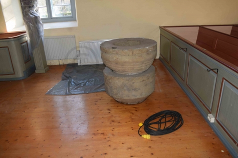 Scene Description: Source caption: "Dopfuntsskål, cylindrisk, 1200-talet; dopfuntsskål, profilerad; emellan dessa (tillhörande?) brandspruta" [NB: the object in the middle appears to be an old fire-extinguishing pump]