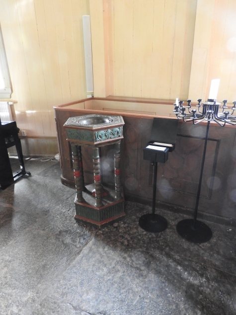 Lagerlöff (1985) reports that there is no inventory left from the medieval wooden church here [="Några medeltida inventarier har ej bevarats."] The new church was bult in 1712 after the earlier one had been demolished. The present font in the 18th-century church is modern [i.e., post-1700].