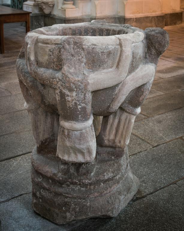 Scene Description: Source caption: "Fonts baptismaux de l'église Saint-Sauveur de Plancoët. Brezhoneg: Maen-badez iliz Plangoed."