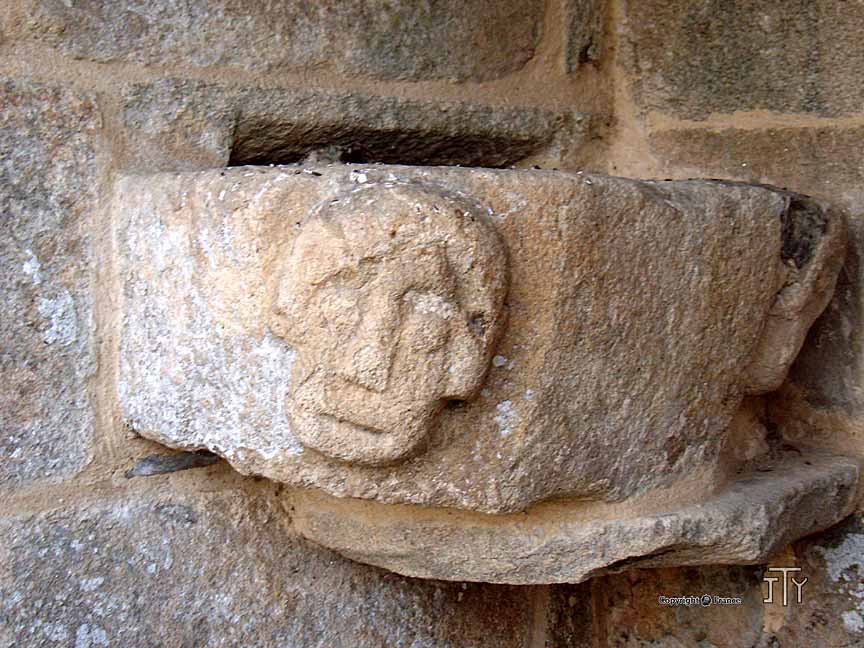 Nord et la partie datée du XVe Siècle. Avant de franchir la porte cintrée avec ses deux grosses moulures mi-cylindriques, on peut se signer à l’aide du bénitier cylin-drique en pierre posé lui-même sur un support de granite. A l’extérieur, un autre bénitier passe l’usure du temps. Est-ce à l’origine un support de croix du XVe ou du XVIe ? Il est sculpté sur ses faces des quatre Evangélistes. A l’opposé, au Sud, près de la petite porte abritée sous un appentis fixé entre deux contreforts, est accroché un vieux bénitier bordé de figures grotesques. Un symbolisme ancien plus difficile à décrypter que celui du bénitier."