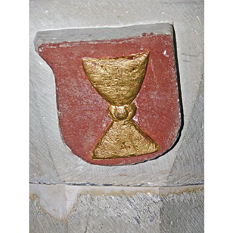 Listed in Meier-Kreiskott (2011) with date ca. 1500: "8-eck, Wappen an schräger Beckenwandung. Der dreigeteilte Aufbau besteht aus einem einfachen Sockel, der vom Viereck ins Achteck überleitet. Die Höhe des kantig wirkenden Schaftes entspricht in etwa der des Beckens, das sich trichterartig nach oben weitet. Ein schmales Wulst- und Stegprofil schließen den Aufbau ab. An der schrägen Beckenwandung befinden sich Wappenschilde." [references cited: Paul Keppler, Württemberg’sche kirchliche Kunstalterthümer, Rottenburg 1888, page 19; Eduard Paulus, Die Kunst- und Alterthums-Denkmale im Neckarkreis, (Eduard Paulus (Hg.), Kunst- und Alterthums-Denkmale im Königreich Württemberg), Stuttgart 1889, page 78; Karl Halbauer, Predigstül, (Veröffentlichungen der Kommission für geschichtliche Landeskunde in Baden-Württemberg, Reihe B, Bd. 132), Stuttgart 1997, page 221]. The entry for this church in Kirchen Online [http://www.kirchen-online.org/kirchen--kapellen-in-baden-wuerttemberg/hessigheim---martinskirche.php] [accessed 13 December 2022] describes and illustrates a baptismal font 'in the Germanic style' with an octagonal basin on four of which sides are: 1) a hape(?), 2) an abbot's staff, 3) a chalice and 4) a stonemason's mark: "Der im germanischen Styl gehaltene Taufstein ist achteckig; an 4 Seiten desselben sind Wappenschilde mit folgenden Zeichen ausgehauen, 1) eine Hape, 2) ein Abtsstab (das Ortswappen), 3) ein Kelch und 4) ein Steinmetzenzeichen." The entry in Kirche in Hessignheim [https://kirche-in-hessigheim.de/kirchengemeinde/geschichte-kirche/] [accessed 13 December 2022] notes: "Unter dem nördlichen „Baldachin“ steht ein bemerkenswertes spätgotisches Taufbecken, das an vier seiner acht Seiten Wappenschilde mit folgenden Darstellungen trägt: Einen Abtstab (Kloster Hirsau), einen Kelch (Pfarrersymbol), eine Hape (Fleckenzeichen) und ein Steinmetzzeichen."