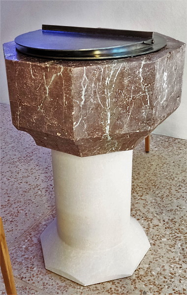 Scene Description: Source caption: "Das Taufbecken stammt aus der Zeit um 1500, besteht aus Rotmarmor und besitzt eine achteckige Form mit einem Durchmesser von 75 cm"