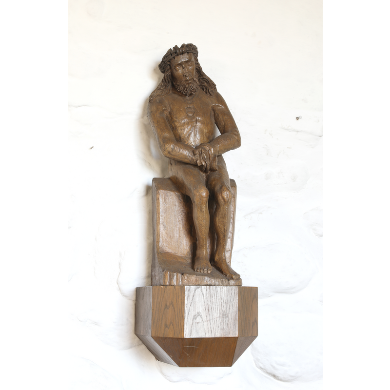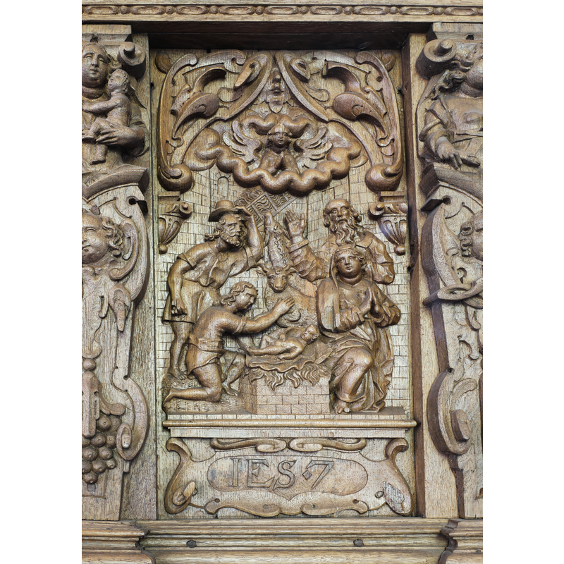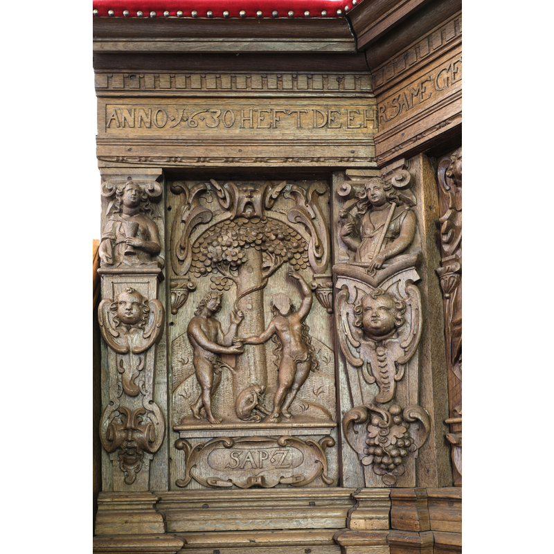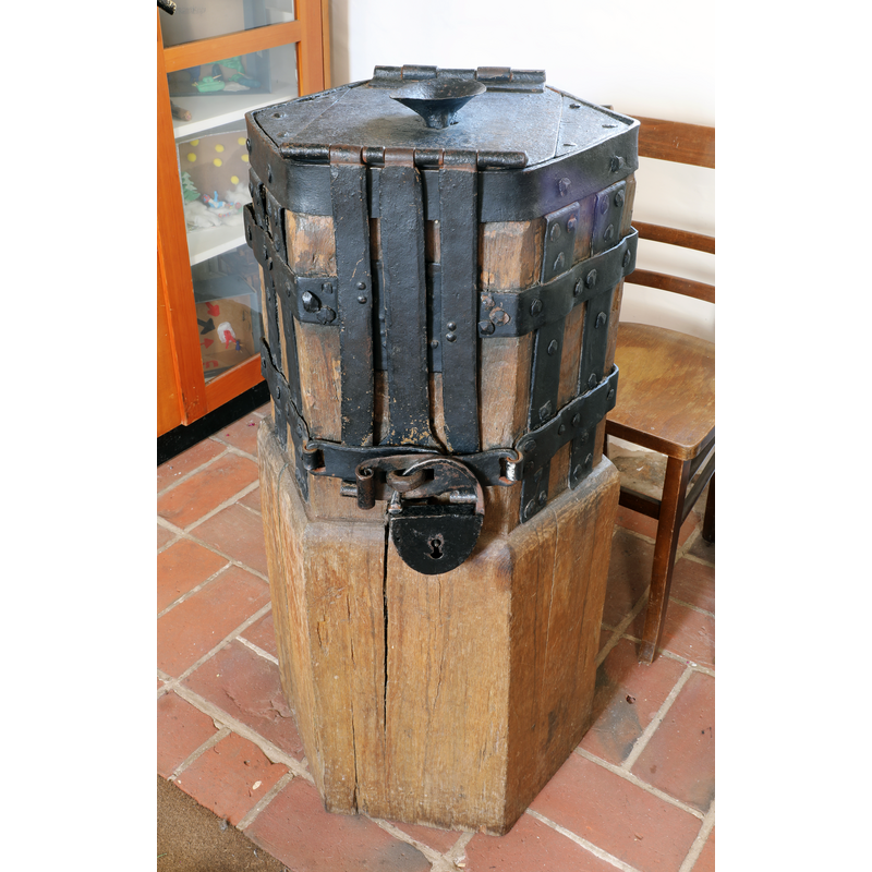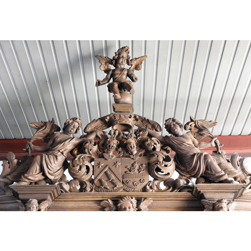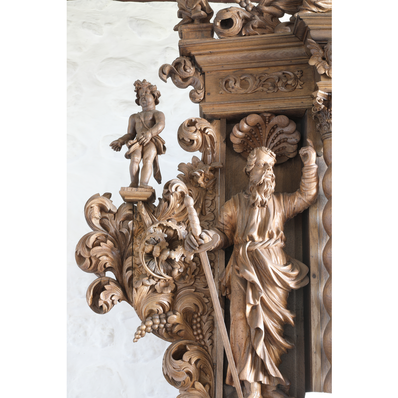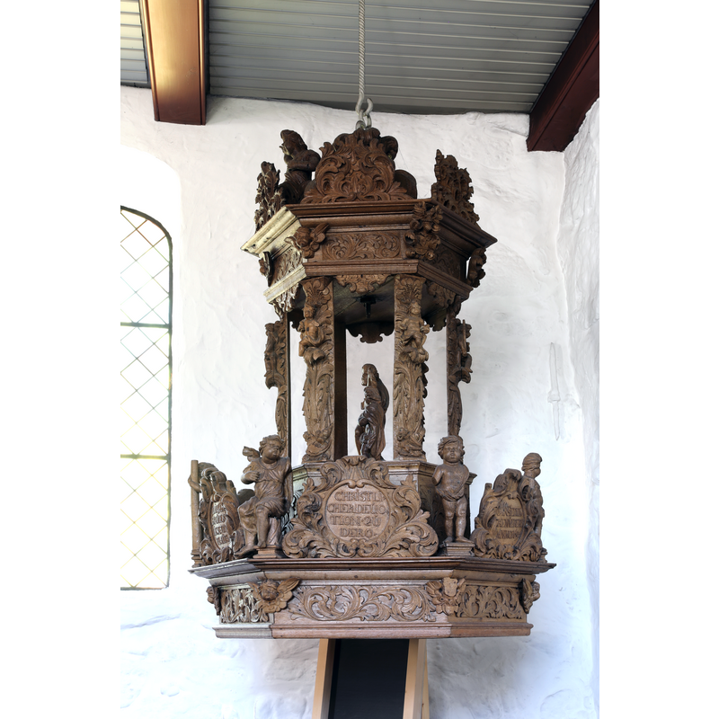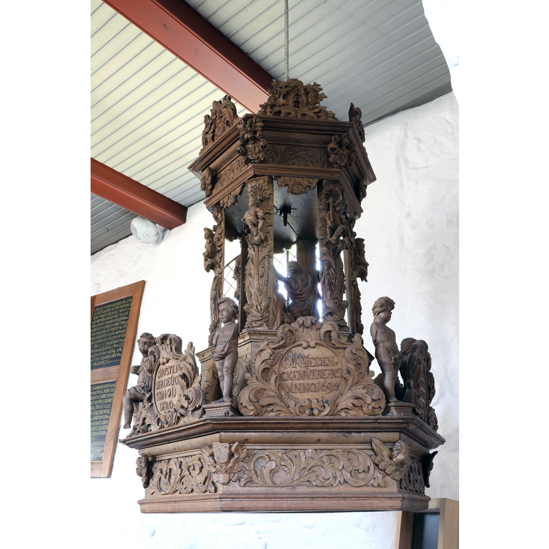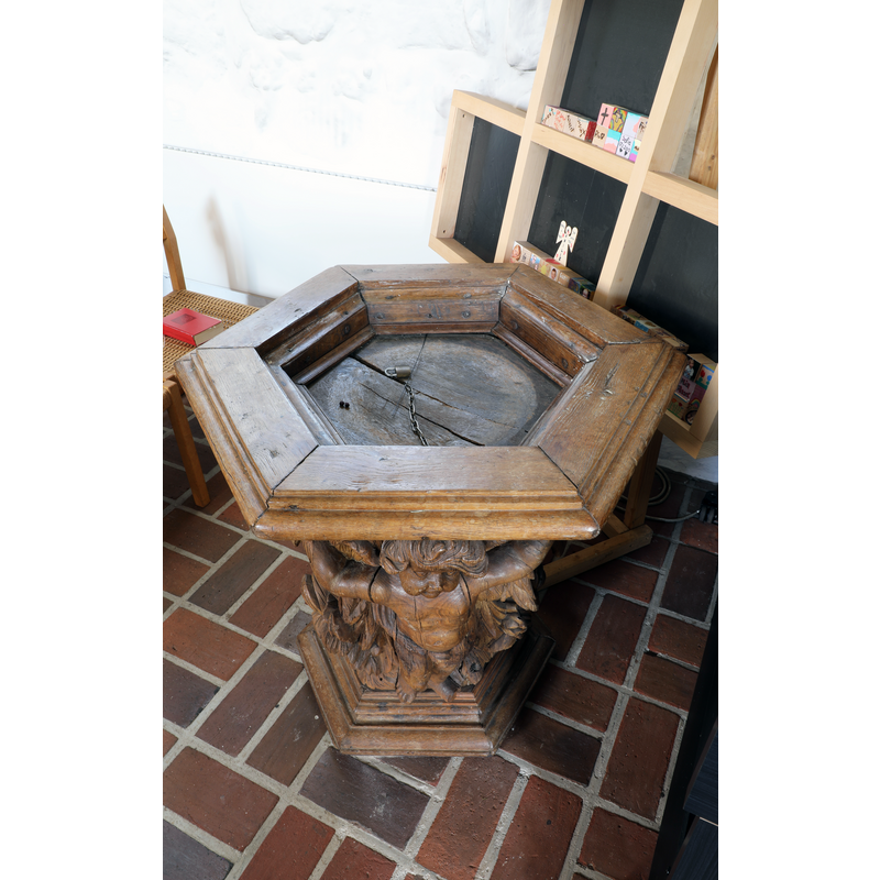 Baptismal font of hexagonal design, made of wwod in 1694, as dated by an inscription on the comtemporary font cover; the font sides are decorated with a large putto-like angel surrounded in deeply-carved floral and foliage motifs; the cover, suspended above, is a towering canopy decorated with figures, motifs, symbols and bears the date of the donation as well as the names of the donors [cf. infra]. Noted in Riechert (2010) as a baptismal font and cover/canopy donated by the "hochgräfl. rantzauischen Raths" Michael Gude and his wife Anna, in 1694.